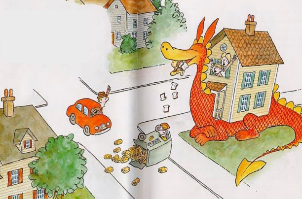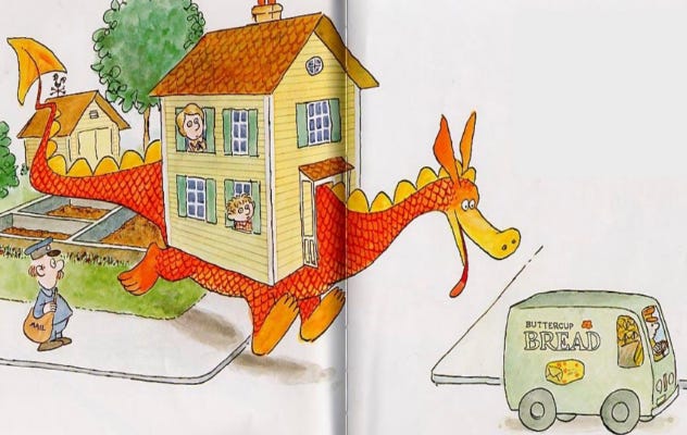A un certo punto il drago, affamato dopo il riposino, cominciò a inseguire un camioncino del pane che passava di lì. E si portò dietro la casa, talmente grande che era diventato.