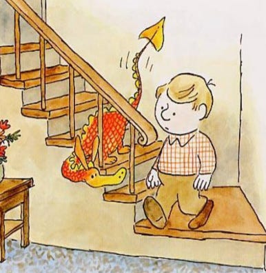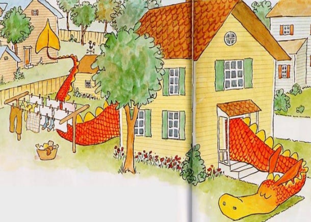 Il drago però lo seguì giù dalle scale, in sala, e iniziò a crescere. Prima diventò grande come un cane, poi come una persona, e poi diventò così grande da riempire tutta la casa.