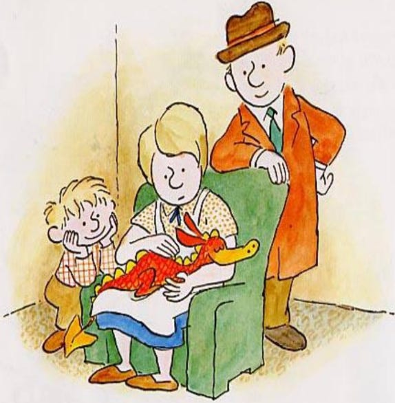 Quando il papà tornò, notò che la casa non c’era più, ma seguendo le indicazioni di una vicina, la trovò ed entrò dalla finestra arrampicandosi sul drago.